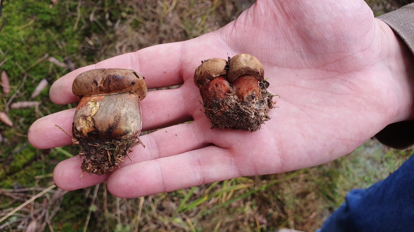 Эти двойные грибы на срезе сначала краснеют, а потом постепенно синеют. На фото они еще красные. А второй гриб хороший - дубовик крапчатый. Он сразу синеет на срезе.