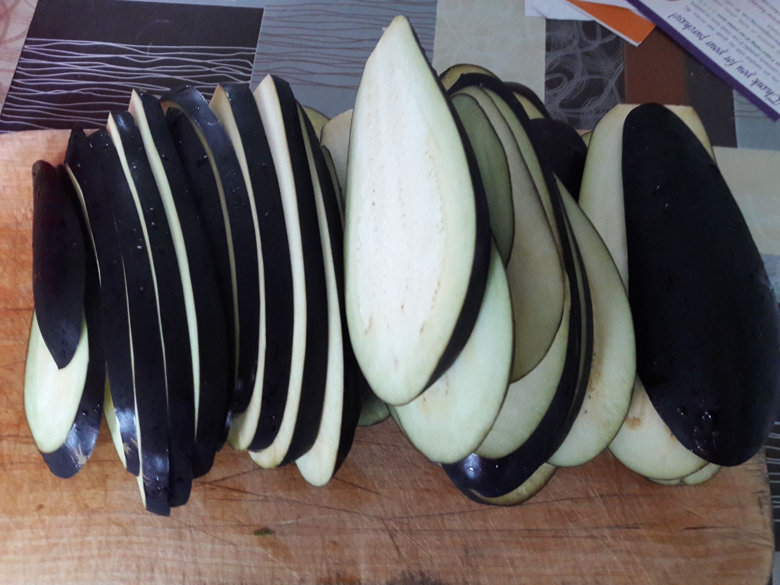 1. Баклажаны моем и режем на дольки. Толщина примерно 7-10мм.